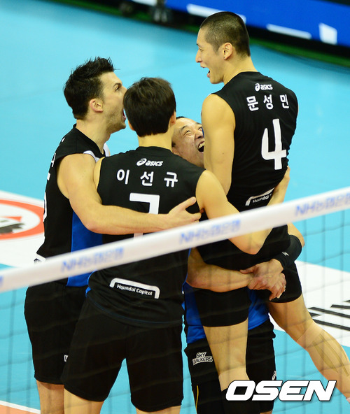 2세트 현대캐피탈 문성민이 득점에 성공하자 최태웅이 기뻐하고 있다.