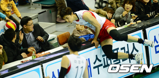 1세트 LIG손해보험 하현용이 볼을 처리하기 위해 관중석으로 몸을 날리고 있다.