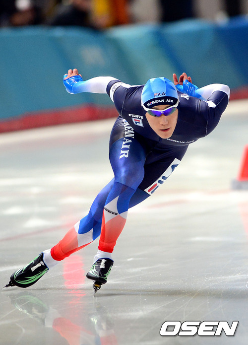 23일 태릉 국제스케이트장에서 열린 'KB금융 스피드스케이팅 챔피언십 2012' 남자부 500M 경기에서 모태범이 역주하고 있다.