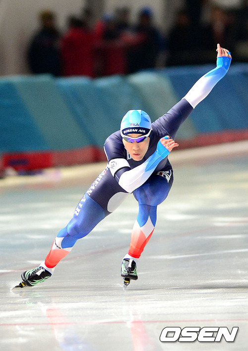 23일 태릉 국제스케이트장에서 열린 'KB금융 스피드스케이팅 챔피언십 2012' 남자부 500M 경기에서 모태범이 역주하고 있다.