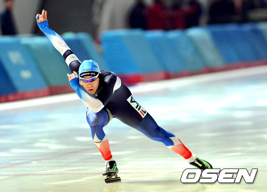 23일 태릉 국제스케이트장에서 열린 'KB금융 스피드스케이팅 챔피언십 2012' 남자부 500M 경기에서 모태범이 역주하고 있다.
