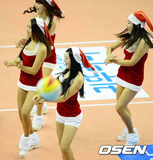 LIG손해보험 치어리더가 크리스마스를 이틀 앞두고 산타 복장을 입고 말춤을 추며 응원을 펼치고 있다.