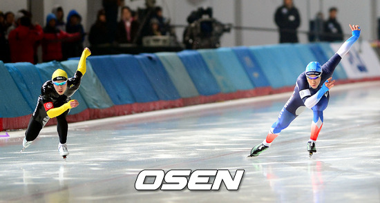 23일 태릉 국제스케이트장에서 열린 'KB금융 스피드스케이팅 챔피언십 2012' 남자부 500M 경기에서 왼쪽 김성규(단국대)와 오른쪽 모태범(대한항공)이 역주하고 있다.