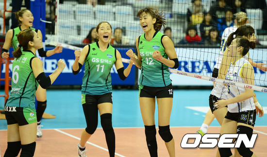3세트 매치포인트에서 GS칼텍스 한송이가 득점에 성공하며 동료선수들과 기뻐하고 있다./jpnews@osen.co.kr