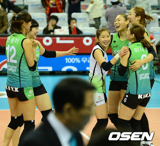 3세트 매치포인트에서 GS칼텍스 한송이가 득점에 성공하며 동료선수들과 기뻐하고 있다./jpnews@osen.co.kr