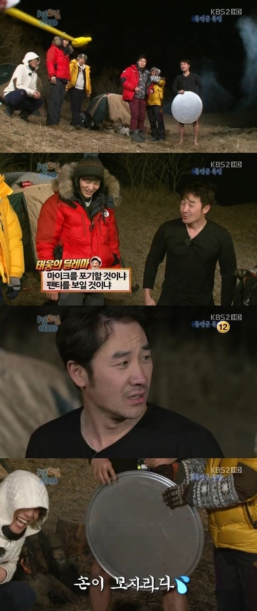 엄태웅은 23일 오후 방송된 KBS 2TV 예능프로그램 '해피선데이-1박 2일(이하 '1박 2일')'에서 팀별로 진행된 게임에서 질 때마다 강추위 속에서 옷을 벗는 역할을 맡게 됐다.