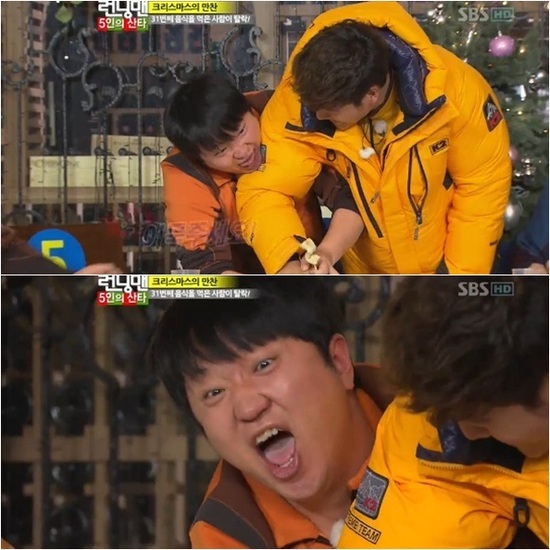 정형돈은 23일 방송된 SBS '일요일이 좋다-런닝맨'(이하 런닝맨)에서 멤버들과 음식 먹기 게임을 벌이던 중 김종국과 힘 대결을 벌였다.