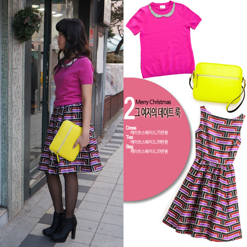 크리스마스에 주인공이 되고 싶은 여자라면 비비드 컬러와 패턴에 과감하게 도전해 볼 것. 기하학적 무늬의 패턴 드레스와 핫 핑크 컬러의 니트, 레몬 옐로우 컬러의 클러치 백은 레드와 그린, 화이트 컬러로 즐비한 크리스마스 거리를 더 활기차게 해 준다.