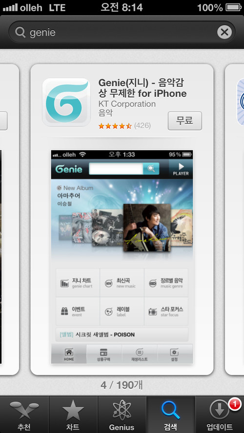 안드로이드용 '지니'는 올레마켓 및 구글 플레이스토어에서 다운받을 수 있다.