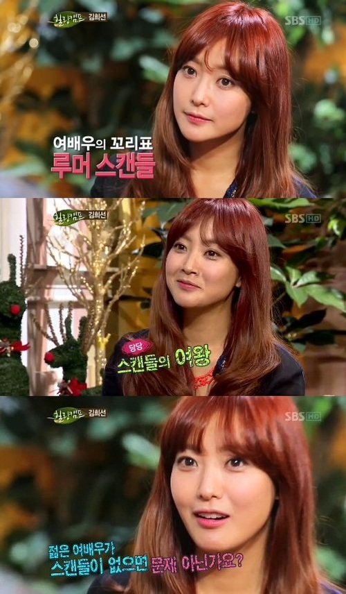 김희선은 24일 방송된 SBS '힐링캠프, 기쁘지 아니한가'(이하 힐링캠프)에서 "내 스캔들 기사를 보면 재미있다"고 밝혔다.