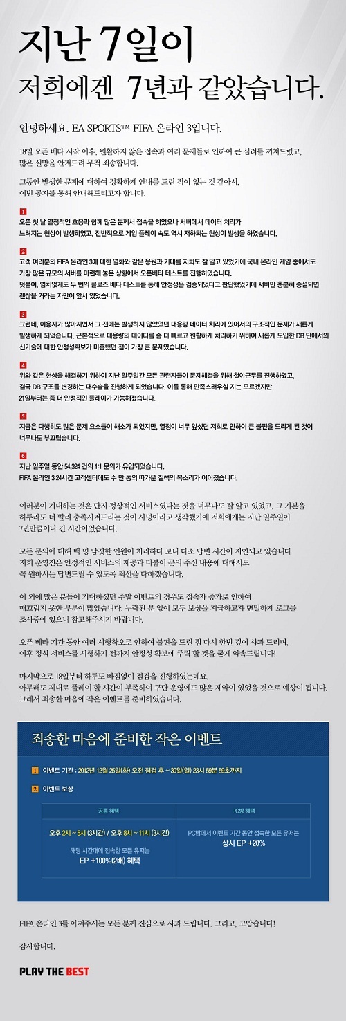 넥슨은 24일 오후 피파온라인3 게임 홈페이지에 '베타테스트 당시 안정성이 검증됐다고 판단했었에 서버만 충분히 증설되면 괜찮을 거라는 자만이 앞서 있었습니다. 새롭게 도입한 DB 단에서의 신기술에 대한 안정성 확보가 미흡하면서 서버 데이터 처리와 게임플레이 속도가 저하됐습니다'라면서 '고객 여러분께 큰 불편을 드려 죄송합니다. 여러분께서 원하는 거는 정상적인 서비스였다는 것을 너무나도 잘 알고 있었고, 그 기본을 하루라도 더 빨리 충족시켜드리는 것이 사명이라고 생각했기에 저희에게는 지난 1주일이 7년만큼이나 긴 시간이었습니다. 안정적인 서비스 운영을 위해 최선을 다하겠습니다'라고 사과문을 올렸다.