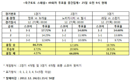 잉글랜드 프리미어리그 3경기 대상 축구토토 스페셜+ 49회차 투표율 중간집계 결과