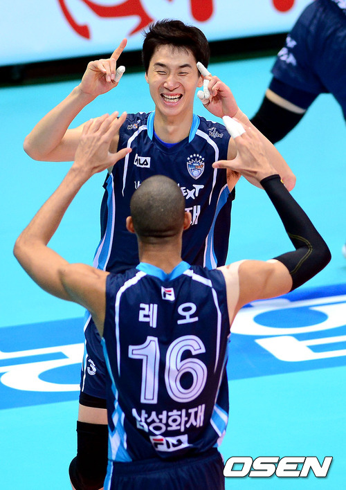 25일 오후 인천 도원체육관에서 열린 '2012-2013 NH농협 V리그' 남자부 대한항공과 삼성화재의 경기, 2세트 삼성화재 박철우가 블로킹으로 득점을 올린 뒤 레오와 기뻐하고 있다.