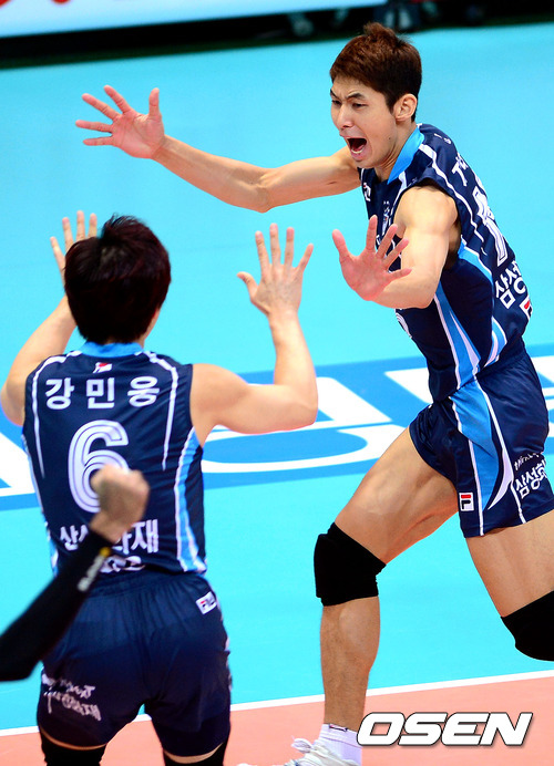 25일 오후 인천 도원체육관에서 열린 '2012-2013 NH농협 V리그' 남자부 대한항공과 삼성화재의 경기, 2세트 삼성화재 지태환이 블로킹으로 득점을 올린 뒤 강민웅과 기뻐하고 있다.
