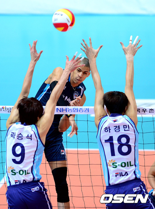 25일 오후 인천 도원체육관에서 열린 '2012-2013 NH농협 V리그' 남자부 대한항공과 삼성화재의 경기, 1세트 삼성화재 레오가 대한항공 곽승석과 하경민의 블로킹을 피해 스파이크를 때리고 있다.