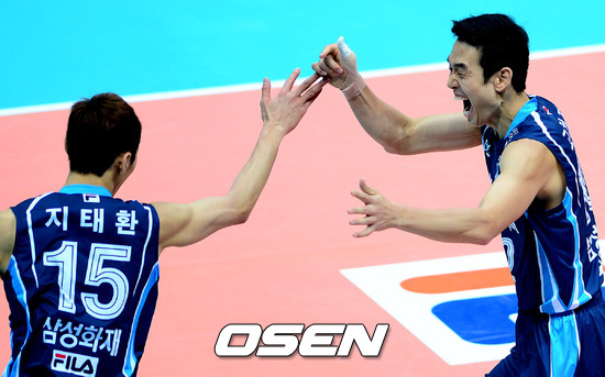 25일 오후 인천 도원체육관에서 열린 '2012-2013 NH농협 V리그' 남자부 대한항공과 삼성화재의 경기, 2세트 삼성하재 고희진이 득점을 올린 지태환과 기뻐하고 있다.