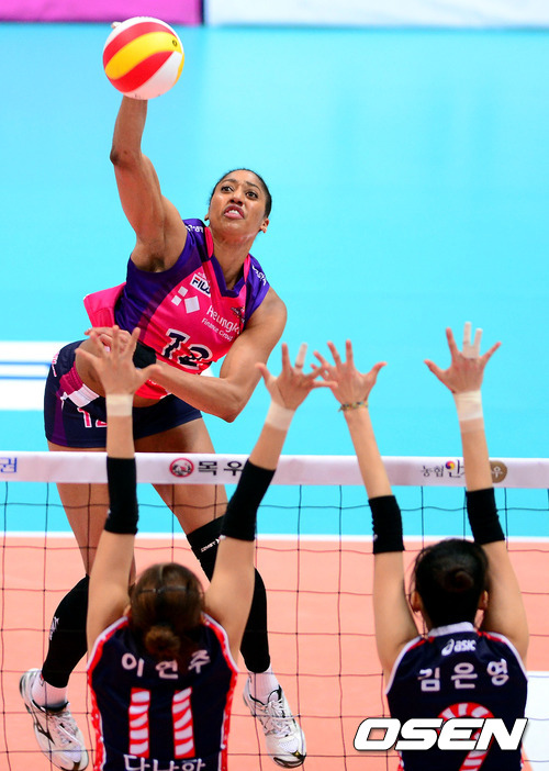 25일 오후 인천 도원체육관에서 열린 '2012-2013 NH농협 V리그' 여자부 흥국생명과 KGC인삼공사의 경기, 1세트 흥국생명 휘트니가 인삼공사 이현주와 김은영을 앞에두고 스파이크를 때리고 있다.