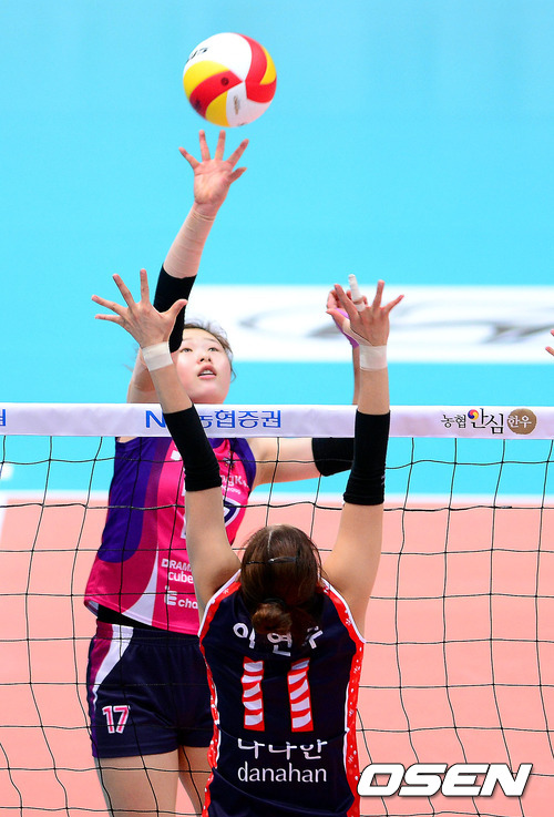 25일 오후 인천 도원체육관에서 열린 '2012-2013 NH농협 V리그' 여자부 흥국생명과 KGC인삼공사의 경기, 1세트 흥국생명 이진화가 인삼공사 이연주의 블로킹을 피해 공격을 시도하고 있다.