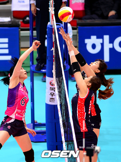 25일 오후 인천 도원체육관에서 열린 '2012-2013 NH농협 V리그' 여자부 흥국생명과 KGC인삼공사의 경기, 2세트 흥국생명 주예나가 블로킹을 피해 가볍게 공을 넘기고 있다.