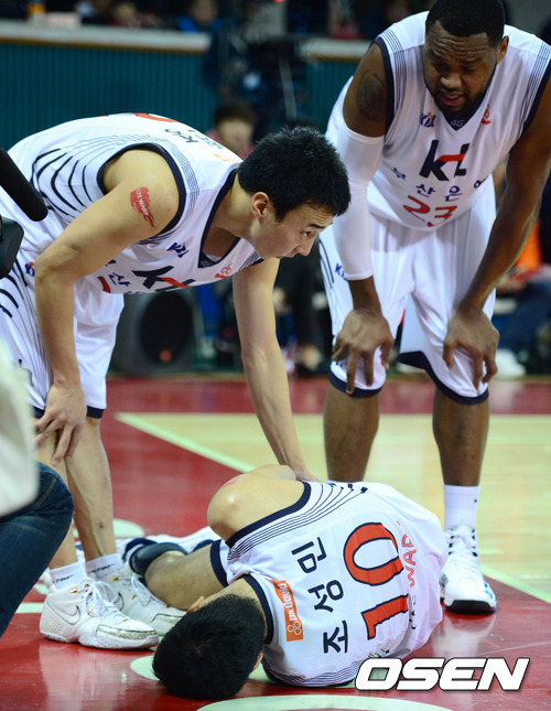 25일 오후 서울 잠실학생체육관에서 열린 'KB 국민카드 2012-2013 프로농구' 서울 SK와 부산 KT와의 경기, 3쿼터 SK 김선형과 부딫혀 KT 조성민이 고통스러워 하고 있다.