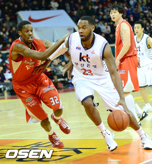 25일 오후 서울 잠실학생체육관에서 열린 'KB 국민카드 2012-2013 프로농구' 서울 SK와 부산 KT와의 경기, 4쿼터 KT 존슨이 SK 헤인즈를 돌파하고 있다.
