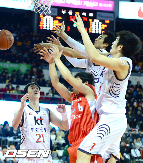 25일 오후 서울 잠실학생체육관에서 열린 'KB 국민카드 2012-2013 프로농구' 서울 SK와 부산 KT와의 경기, 4쿼터 KT 선수들이 공을 잡기위해 손을 뻗고 있다.