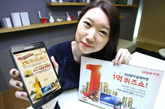 스마트에코본부 신진기 상무는 “2013년을 맞이해 고객들이 올레마켓과 계해년새해를 더욱 기쁘게 맞이하실 수 있도록 ‘1억 퀴즈쇼’이벤트를 준비했다”며, “2013년에도 KT는 고객들의 즐거움을 더할 수 있는 올레마켓이 되기 위해 최선을 다할 것”이라고 말했다.
