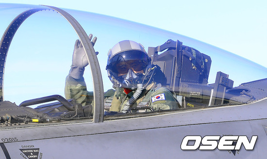 구자철이 F-15K 탑승 후 손을 흔들고 있다