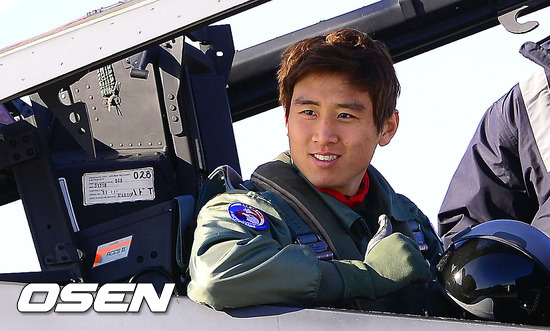 구자철이 F-15K 탑승 후 포즈를 취하고 있다.