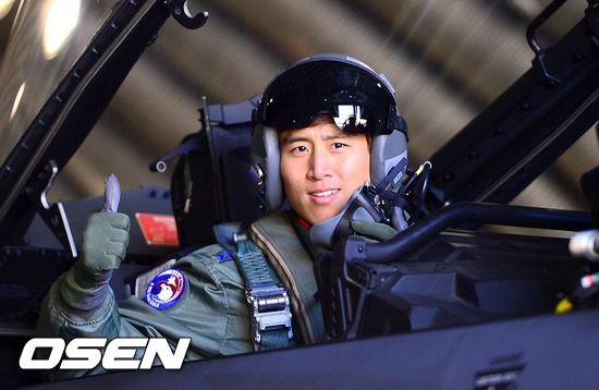 구자철이 F-15K 탑승 후 포즈를 취하고 있다.