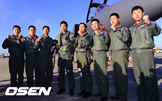 구자철이 F-15K 탑승 전 조종사들과 포즈를 취하고 있다