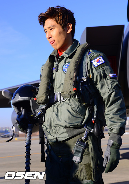 구자철이 F-15K 탑승 전 포즈를 취하고 있다