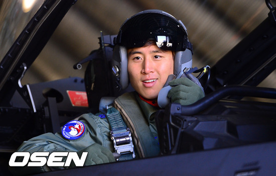 구자철이 F-15K 전투기에서 미소 짓고 있다.