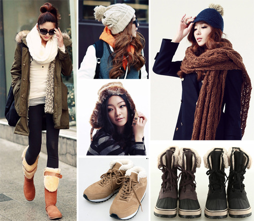 너무 보온성만 신경 쓰느라 전체적인 스타일이 밋밋하다고 생각될 경우 머플러를 레드나, 머스터드 같은 컬러감 있는 타입으로 선택하면 충분히 포인트 있는 스타일링이 연출된다. 슈즈는 안쪽에 퍼 처리가 되어 있는 부츠가 발 시려움을 막기에는 좋다. 운동화의 경우에 발 워머를 신어 종아리를 보호해주면 보온성은 물론 스타일까지 살릴 수 있다.