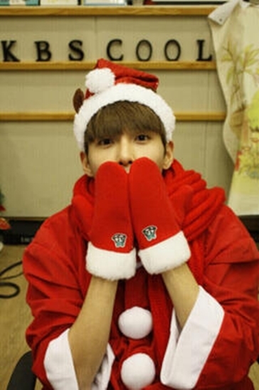 사진 속 려욱은 빨간색 의상과 산타 모자, 장갑을 착용한 채 두 손으로 입을 가리고 있다. 두 눈만을 드러낸 채 애교를 선보이는 모습이 귀여움을 자아낸다.