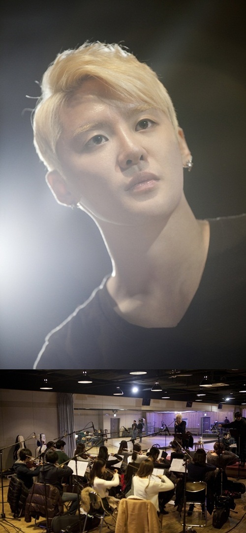 공개 된 사진에는 김준수가 바이올린, 첼로 등의 오케스트라 스트링과 밴드, 브라스 연주자, 코러스들과 어우러져 연습 중인 모습이다.