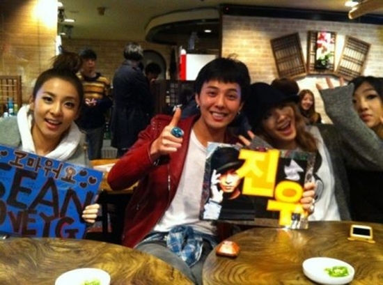 공개된 사진은 올해 지난 1월 일본 오사카 교세라 돔에서 열린 ‘YG패밀리 15주년 기념 콘서트’가 끝난 후 촬영한 것으로 걸그룹 2NE1의 산다라박, 씨엘, 공민지와 그룹 빅뱅의 지드래곤의 모습이 담겨 있다. 이들은 ‘진우’,‘고마워요 션’이라는 문구가 적힌 플래카드를 들고 지누션의 팬클럽이 된 듯한 연출을 하고 있어 웃음을 자아낸다.