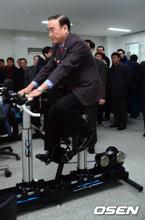 27일 오전 용인시 신갈동에 위치한 스포츠용품시험소에서 열린 '스포츠용품 시험소 이전 개소식'에서 국민체육진흥공단 정정택 이사장이 시험소 장비들을 체험하고 있다.