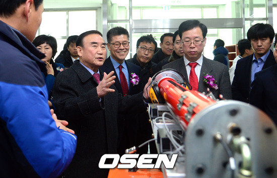 27일 오전 용인시 신갈동에 위치한 스포츠용품시험소에서 열린 '스포츠용품 시험소 이전 개소식'에서 국민체육진흥공단 정정택 이사장이 시험소 장비에 관한 설명을 듣고 있다.