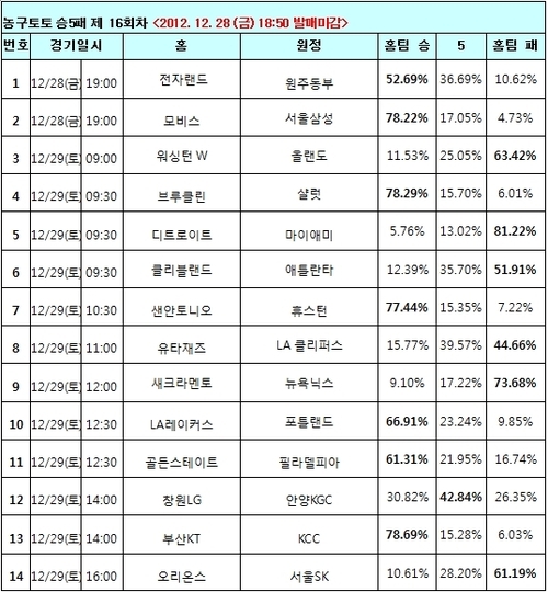 한편 농구토토 승5패 16회차 게임은 오는 28일(금) 오후 6시 50분에 발매가 마감된다.