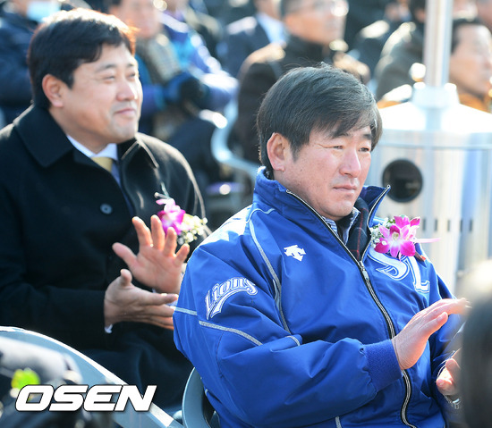 27일 오후 대구 수성구 연호동 부지에서 열린 대구야구장 기공식에서 류중일 감독과 양준혁 해설위원이 박수를 치고 있다.