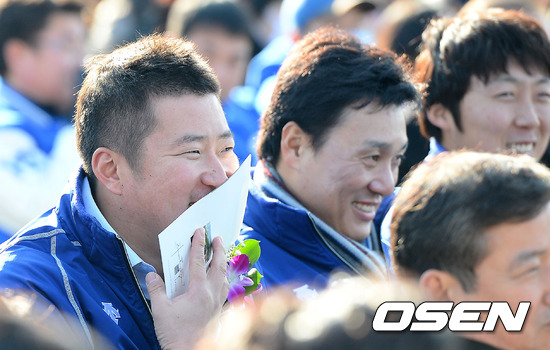 27일 오후 대구 수성구 연호동 부지에서 열린 대구야구장 기공식에서 삼성 라이온즈 최형우가 입을 가리고 웃고 있다.