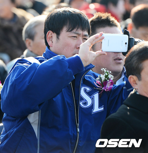 27일 오후 대구 수성구 연호동 부지에서 열린 대구야구장 기공식에서 삼성 라이온즈 진갑용이 핸드폰 카메라로 기공식을 찍고 있다.