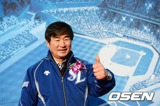 27일 오후 대구 수성구 연호동 부지에서 열린 대구야구장 기공식에서 류중일 감독이 신축 대구야구장 조감도 앞에서 포즈를 취하고 있다.