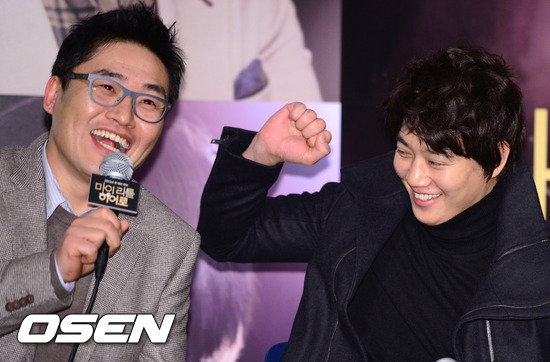 26일 오후 서울 왕십리 CGV에서 열린 '마이 리틀 히어로'(김성훈 감독) 언론배급시사회에서 김성훈 감독의 이야기에 김래원이 격한 반응을 보이고 있다.