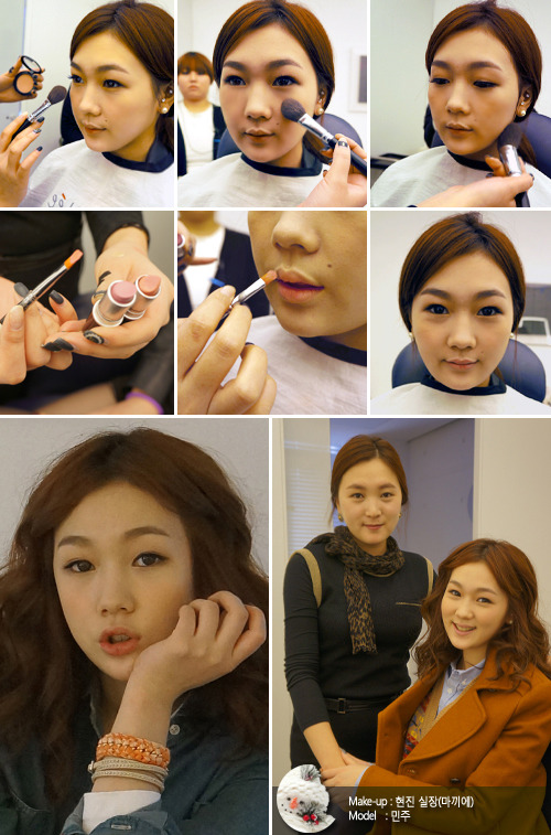 블러셔에 사용된 컬러는 연한 피치톤이다. 얼굴색에서 이어지는 정도로 자연스러운 컬러를 선택하는 것이 포인트다. 현진은 “웃었을 때 튀어나오는 부위에 가볍게 원을 그리듯 발라주어야 한다”며 “블러셔를 바른 이후 섀딩을 하여 전체적인 윤곽을 잡아줘야 한다”고 했다.