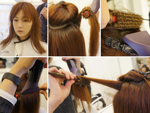 ② 둥근 빗을 이용해 모발뿌리가 수직이 되게 한다