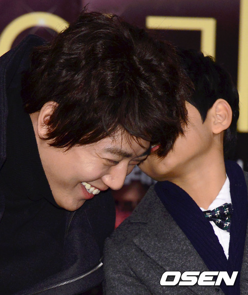 26일 오후 서울 왕십리 CGV에서 열린 '마이 리틀 히어로'(김성훈 감독) 언론배급시사회에서 김래원이 지대한과 귓속말을 하고 있다.