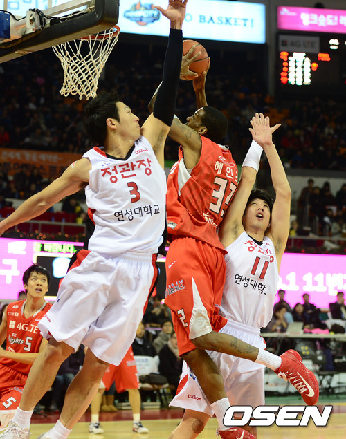 1쿼터 SK 헤인즈가 KGC 이정현 양희종의 수비를 피해 슛을 시도하고 있다.