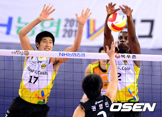 27일 오후 천안 유관순체육관에서 열린 '2012-2013 NH농협 V-리그' 남자부 현대캐피탈과 러시앤캐시의 경기, 2세트 러시앤캐시 다미가 현대캐피탈 권영민의 공격을 블로킹하고 있다.